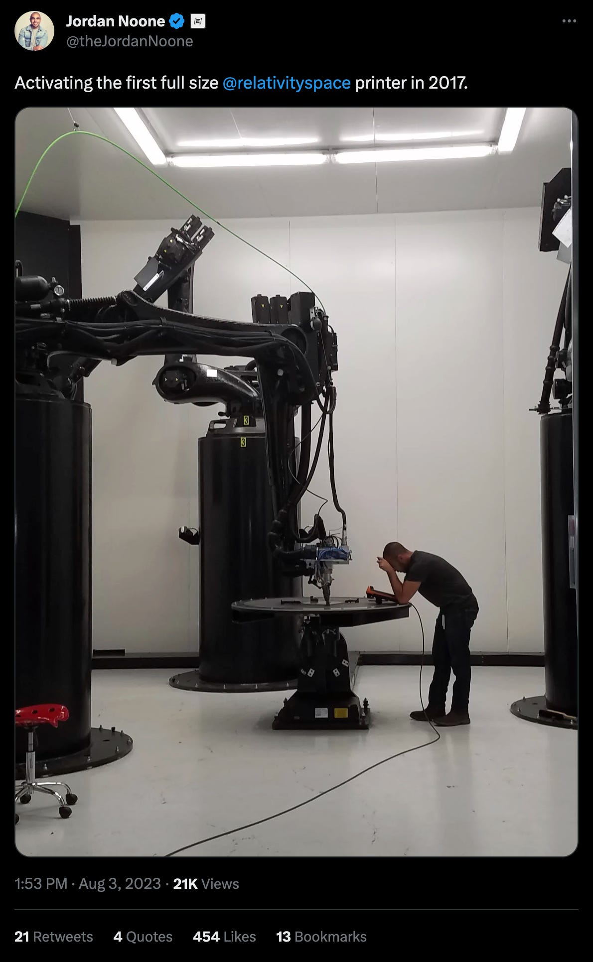 This one’s a bit of a throwback Tweet but this sort of thing really does give you a cool glimpse of the future. This is Relativity Space’s full-sized 3D printer that they use to literally print rockets that they send into space. Check out my article on Relativity if that sort of thing gets your blood pumping like it does mine!