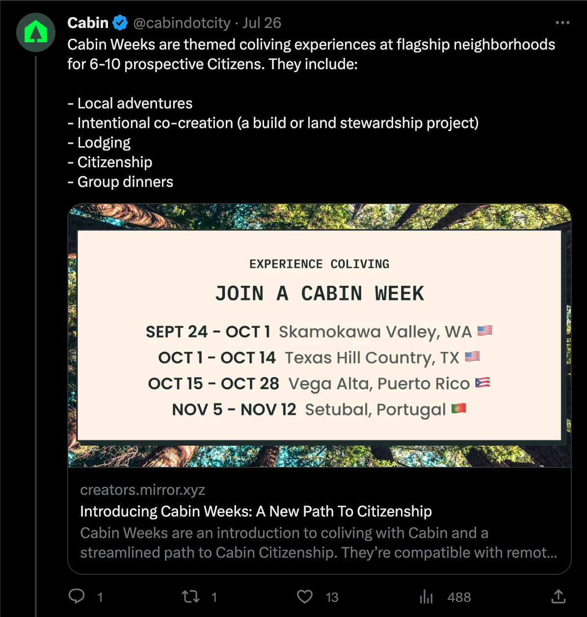 🔮 Glimpse #2 — CabinDAO introduces Cabin Weeks as a pilot for their coliving network